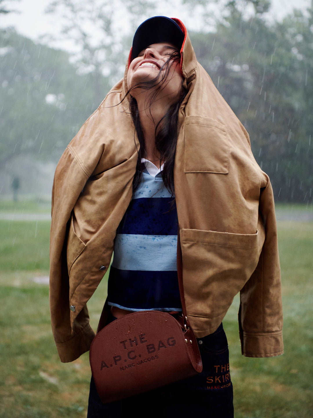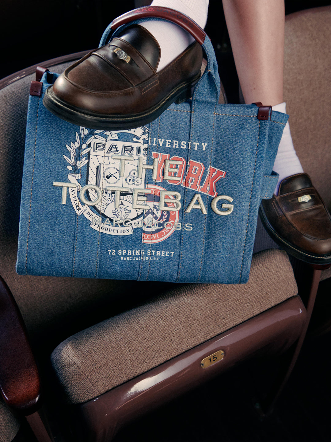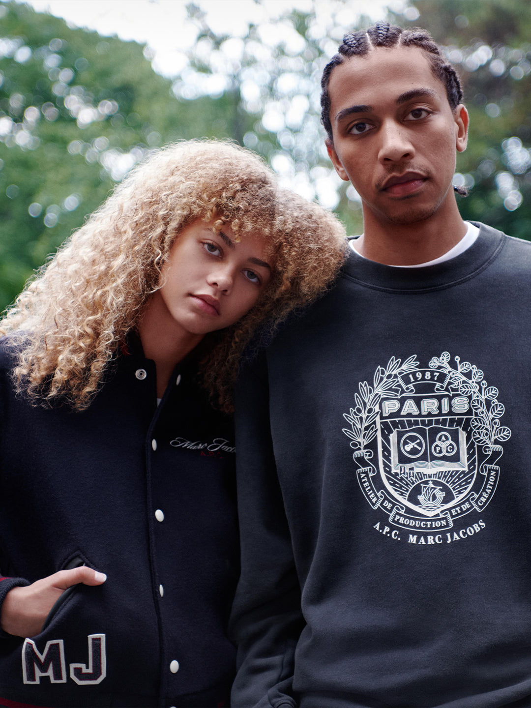 The collection unites two “universities” of style, with Marc Jacobs and A.P.C. crests featured on key pieces and signature embroidery and embossing appearing throughout, including a varsity jacket in wool and cowhide and dual-branded jerseys. Men’s and women’s essentials range from denim jeans (“THE JEAN”), miniskirts (“THE SKIRT”), and a slightly baggy striped shirt (“THE SHIRT”) to Marc Jacobs’ Tote Bag and a collector’s edition of A.P.C.’s Demi-Lune.
