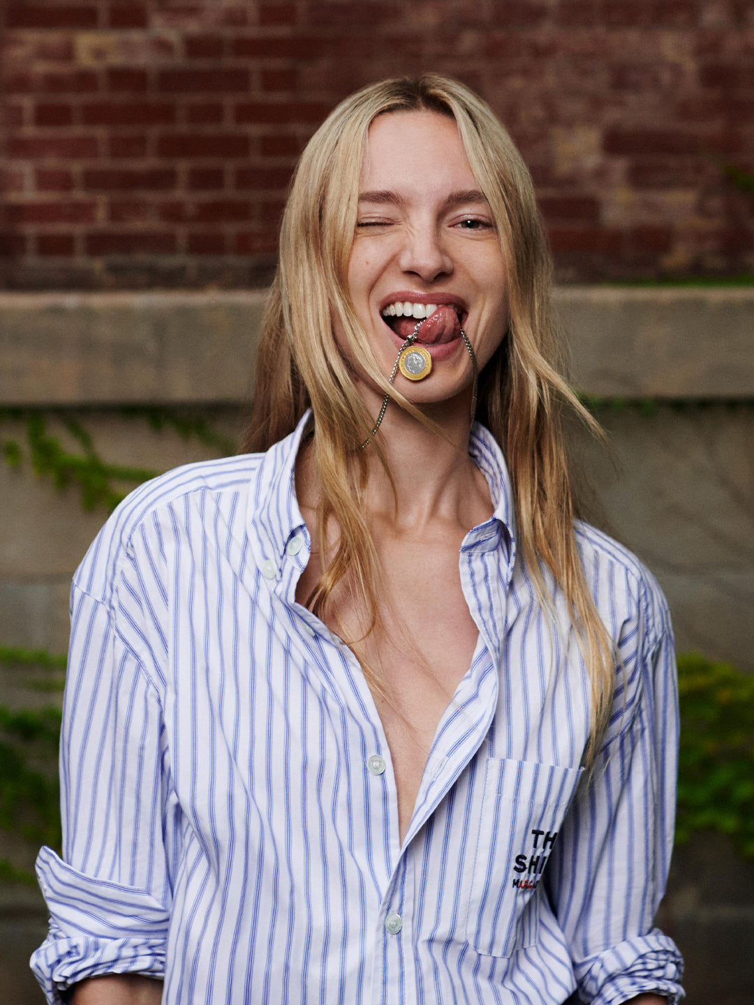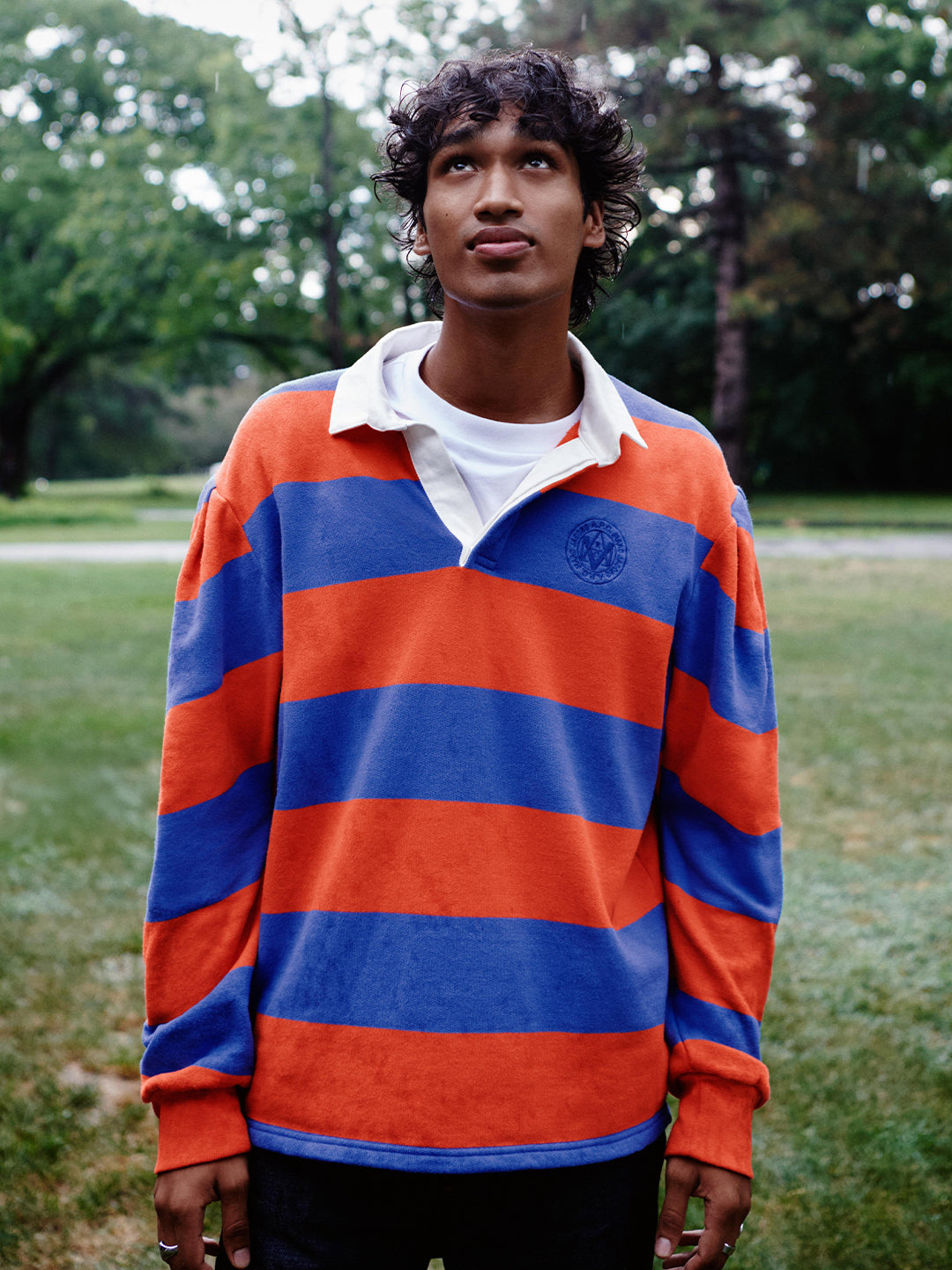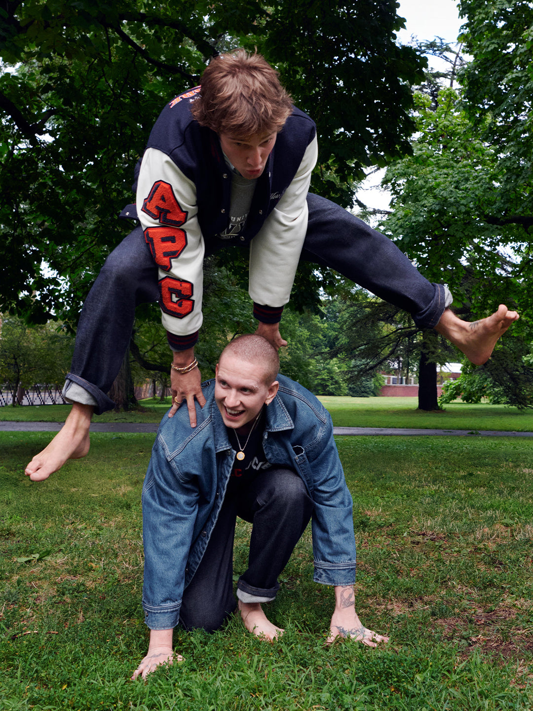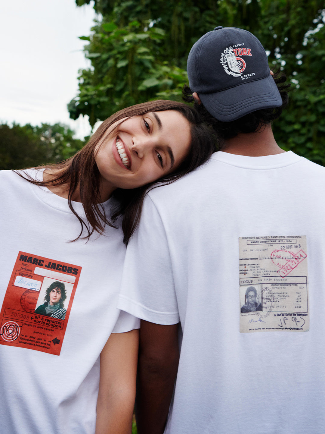 Orange accents appear throughout, on logos, a canvas jacket collar, and the stripes of a fleece polo, referencing Marc Jacobs’ 1980s Paris “Carte Orange” transit pass and Jean Touitou’s Sorbonne student card featured on a T-shirt. Roman Empire–style buttons bearing the designers’ profiles appear on jeans and penny loafers, blending heritage craftsmanship with playful design.