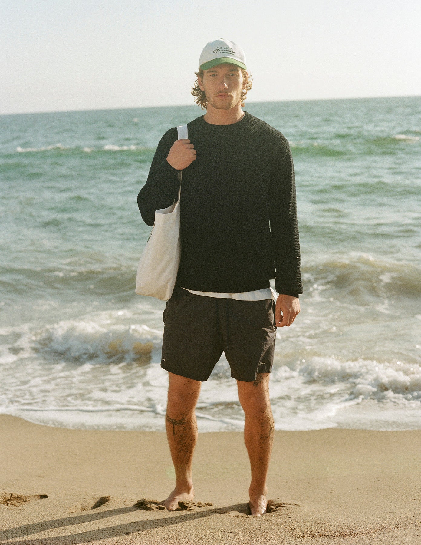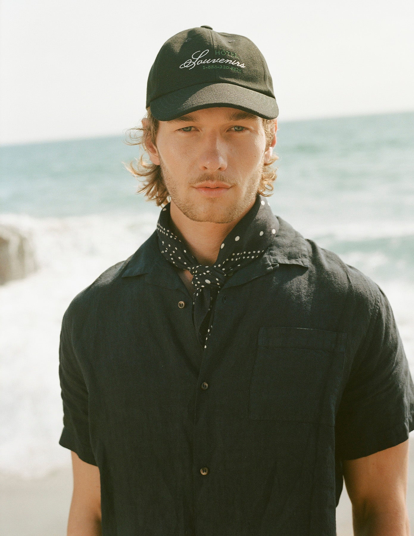 Die Kollektion greift das Wesentliche der Herren-Sommergarderobe auf, allerding mit einer Beobachtung als Ausgangspunkt: Wenn wir darauf achten, dass die Kleidung, die wir mit in den Urlaub mitnehmen, elegant und geschmackvoll ist, führt das dazu, dass wir in der Regel mit viel weniger schicken Einkäufen wieder abreisen. Sei es, dass sie Gegenstand einer Schwärmerei in der Hotelboutique oder eines zwanghaften Kaufs in einem Touristengeschäft sind. Das erste Thema wird durch einen komplett monochromen Look in dunklem Marineblau umgesetzt, das zweite durch Sweatshirts, T-Shirts, Mützen und Tragetaschen mit dem Bild des Hôtel Souvenirs.