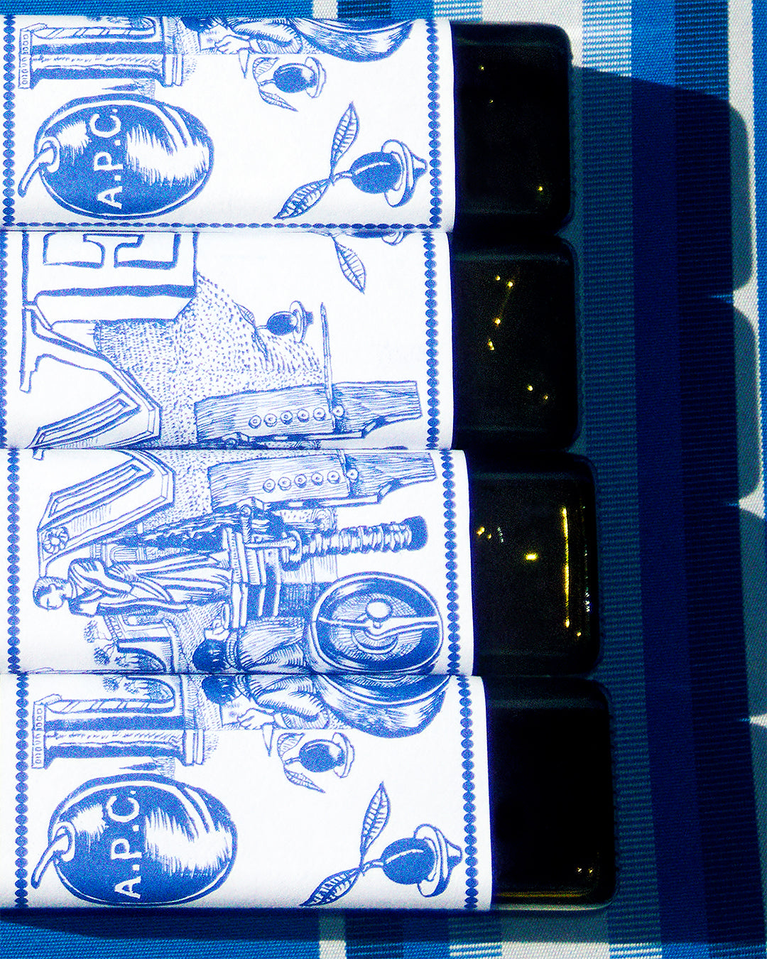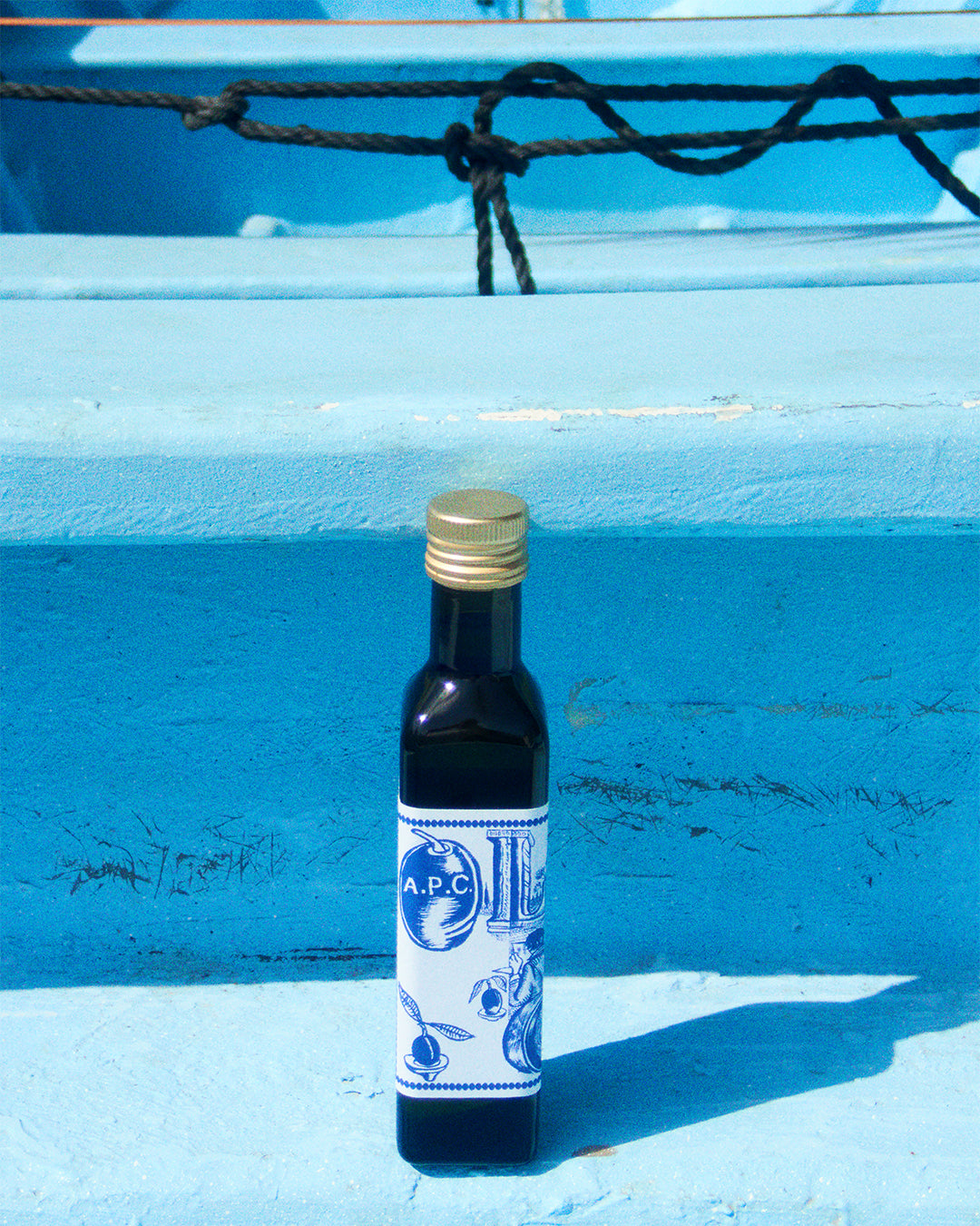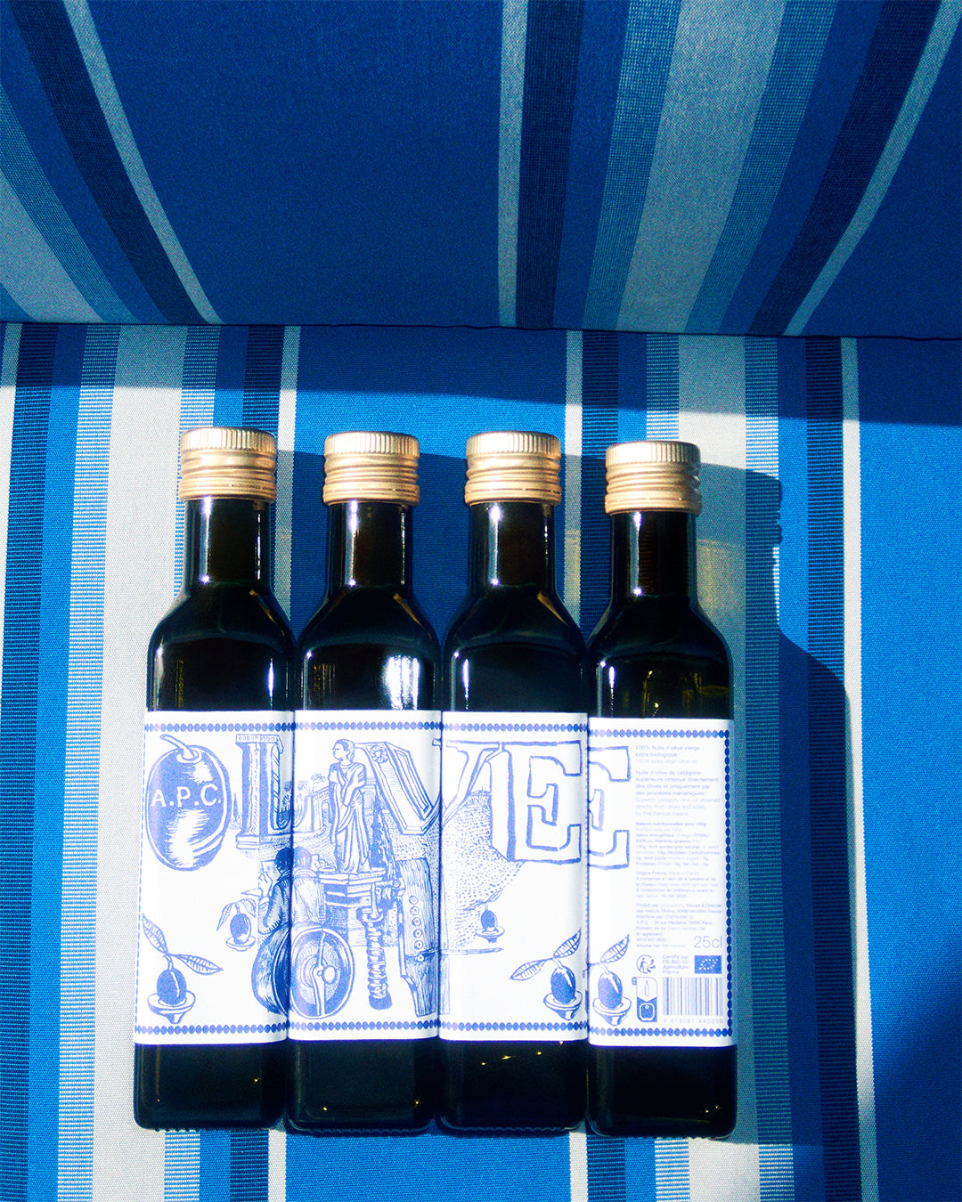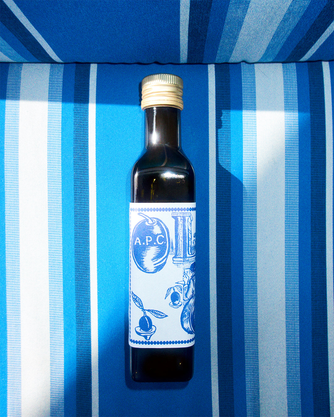 "Mit seiner ausgeprägten Persönlichkeit ist es perfekt, um Gerichte mit eher einfachen Aromen zu begleiten. Probieren Sie es zu Fisch wie Kabeljau oder auch zu Reis, Salzkartoffeln oder Kichererbsen! ", empfiehlt Jean Touitou. A.P.C.-Olivenöl wird in 250-ml-Glasflaschen verkauft, die mit einem originellen Etikett versehen sind, das von Mathias Augustyniak vom Grafikstudio M/M entworfen wurde. In dieser zweiten Saison ist es auf blauem Hintergrund gedruckt. Natives Olivenöl extra A.P.C., Glasflasche 250 ml, 15 €.