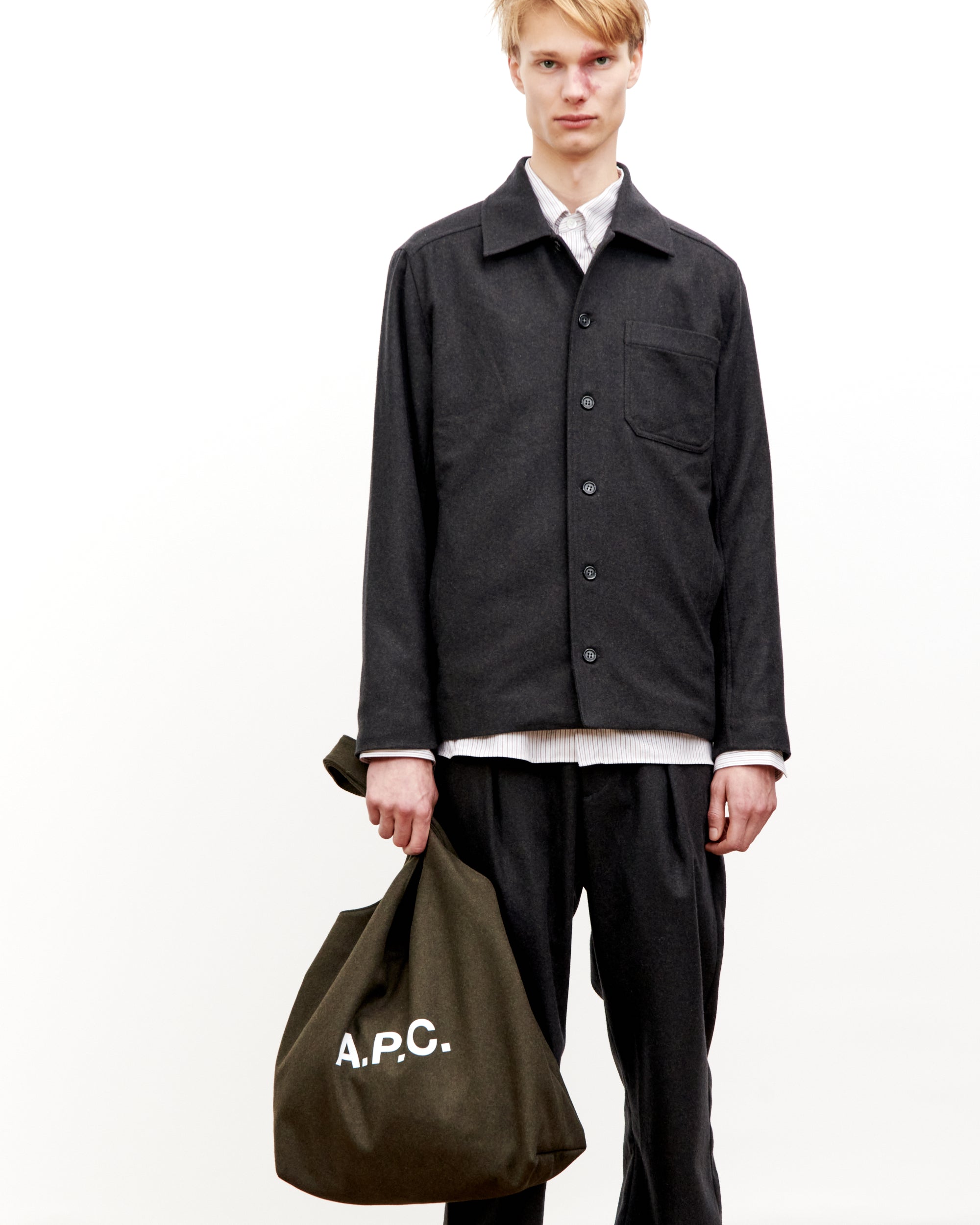 Wendbare khakifarbene und schwarze Unisex-Stoffbeutel mit A.P.C.-Logo.