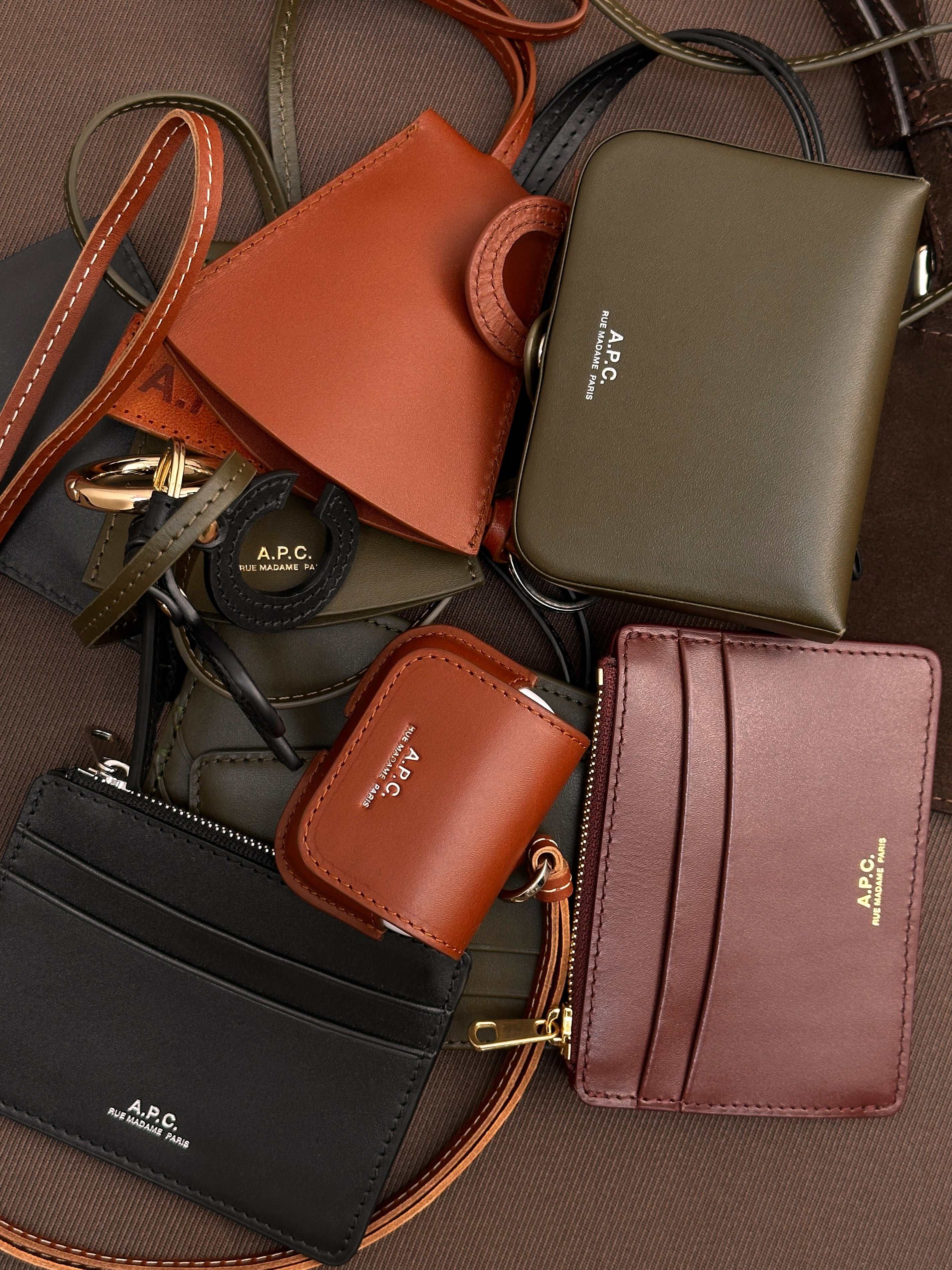 Nussbrauner Schlüsselanhänger aus Glattleder mit A.P.C.-Prägung.