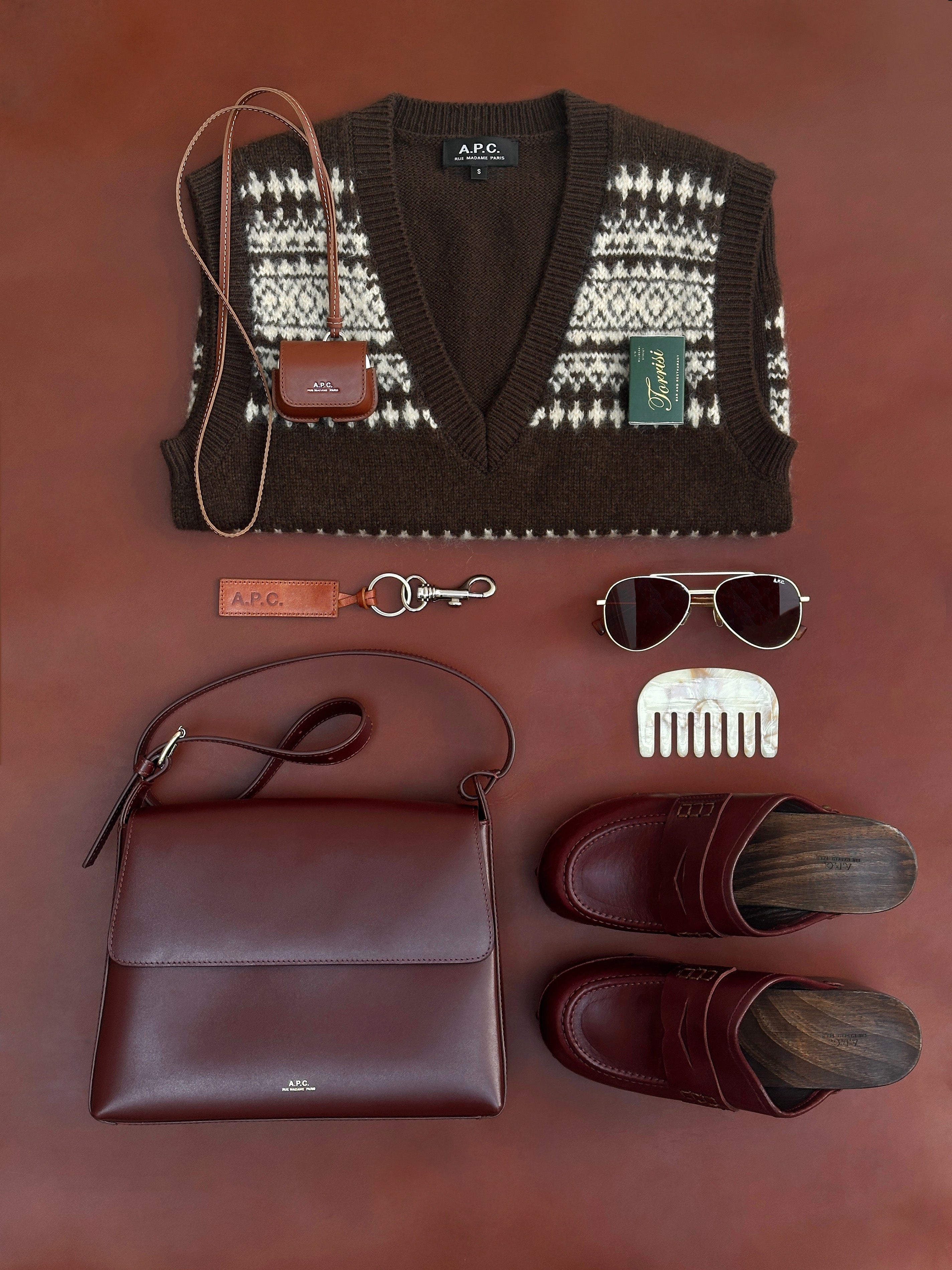 Horizontale Tragetasche aus karamellfarbenem Rippsamt mit A.P.C.-Logo.