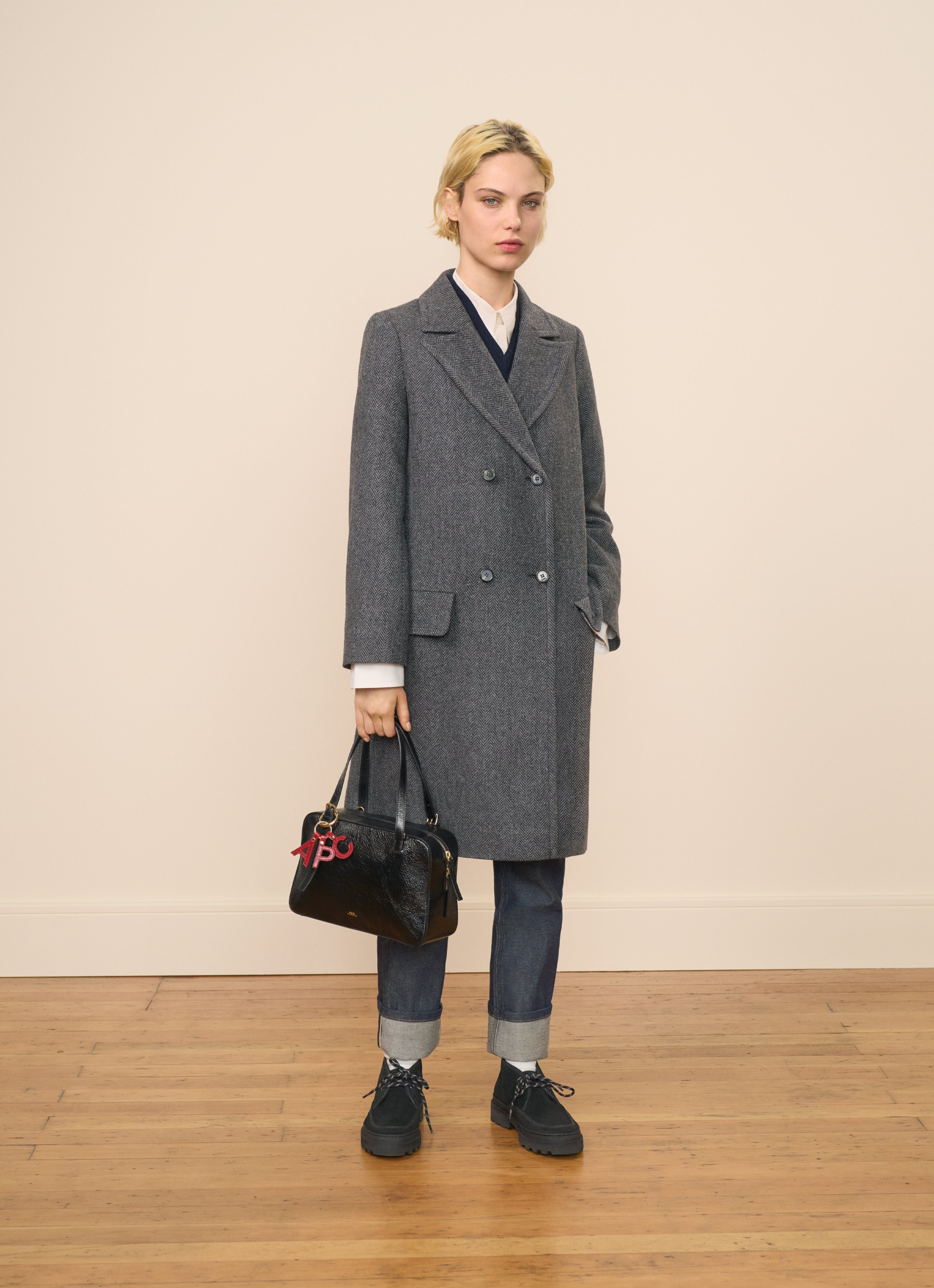 Anthrazitgrauer Mantel aus recycelter Wolle mit Fischgrätmuster.