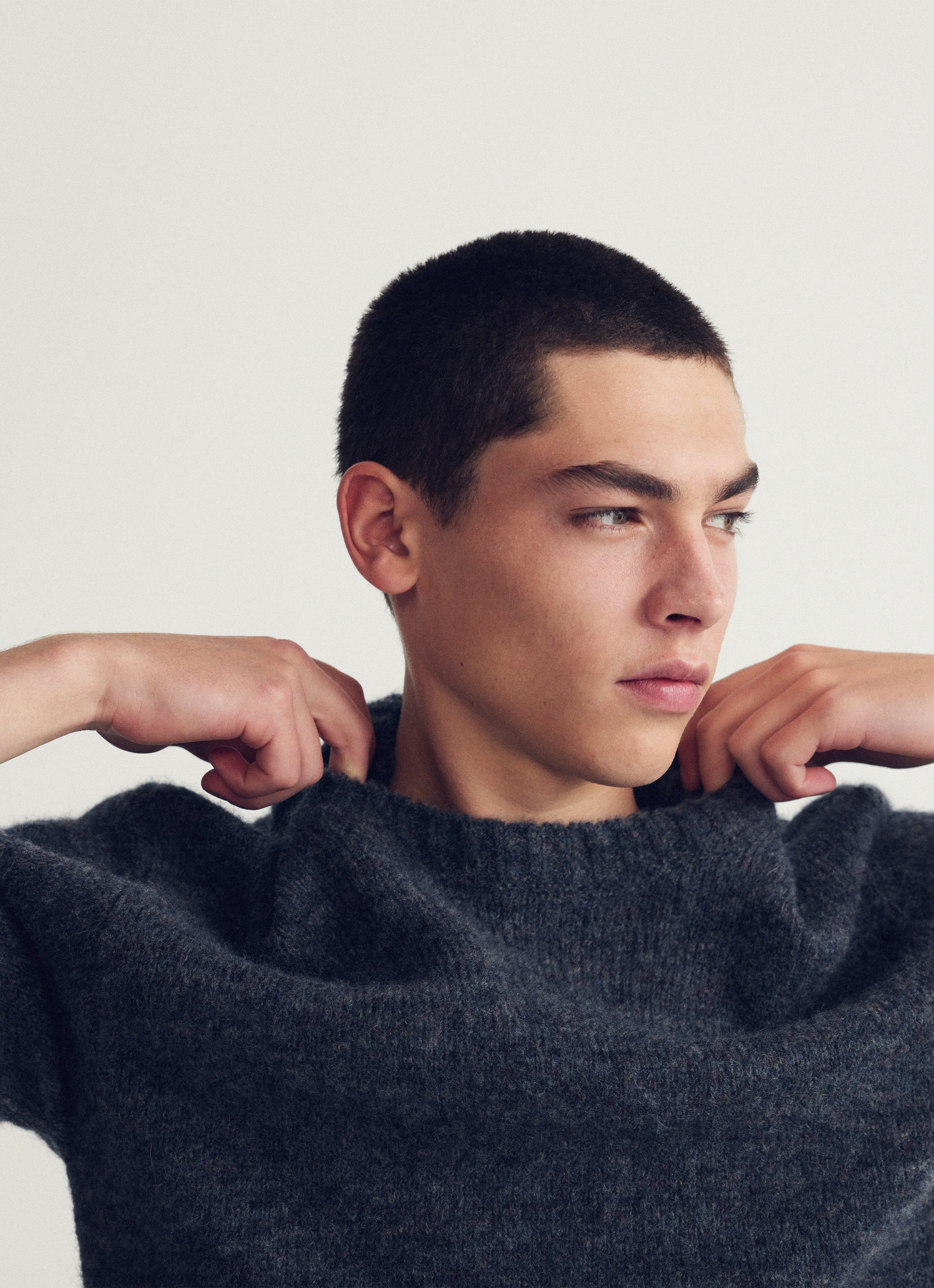 Stahlblau-melierter Pullover aus Merino und Baby-Alpaka.